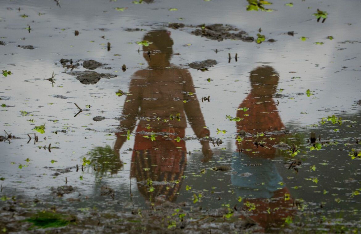 Νεαροί παίζουν με τις λάσπες σε ορυζώνα στην περιοχή Νουγακότ.