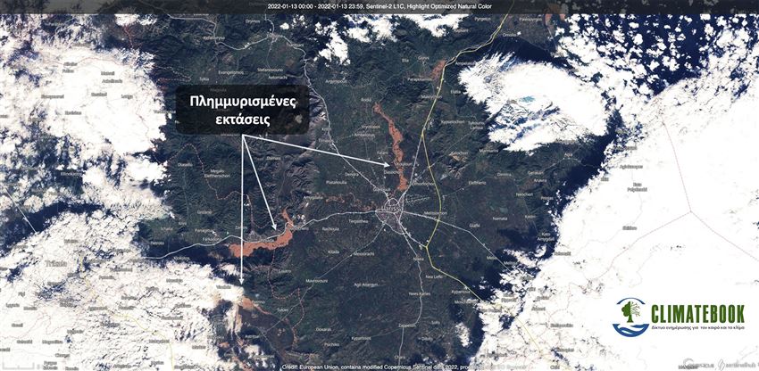 Ο ευρωπαϊκός δορυφόρος Sentinel-2 πέρασε πάνω από τη Θεσσαλία το πρωί της Πέμπτης 13 Ιανουαρίου 2022 καταγράφοντας το μέγεθος των πλημμυρισμένων εκτάσεων στον θεσσαλικό κάμπο.