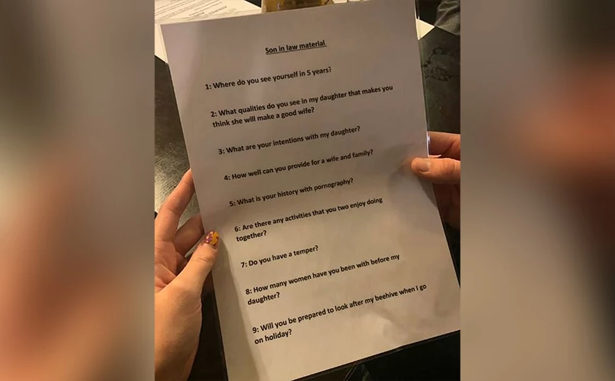 Αίσθηση προκαλεί στο διαδίκτυο το ερωτηματολόγιο ενός πατέρα προς τον σύντροφο της κόρης του, γιατί περιέχει εννέα ερωτήσεις που έπρεπε να απαντήσει, πριν πάρει την έγκριση για να συνεχίσει η σχέση.