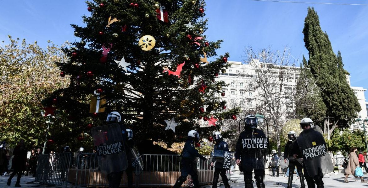 Δυνάμεις των ΜΑΤ έχουν περικυκλώσει το χριστουγεννιάτικο δέντρο στην πλατεία Συντάγματος