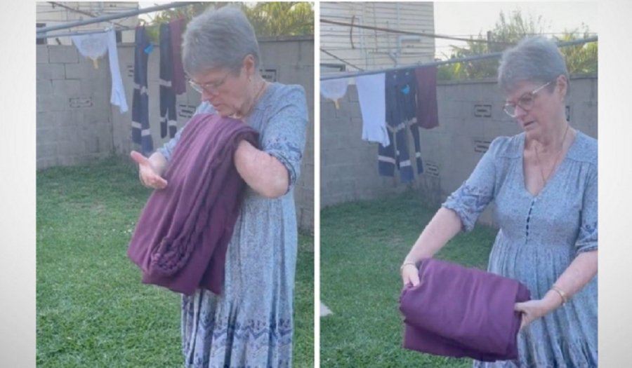 Το βίντεο, που ανέβασε η χρήστης @amymaree922, απεικονίζει τη μαμά της, η οποία διπλώνει τέλεια το σεντόνι της με τη βοήθεια μιας απλώστρας.