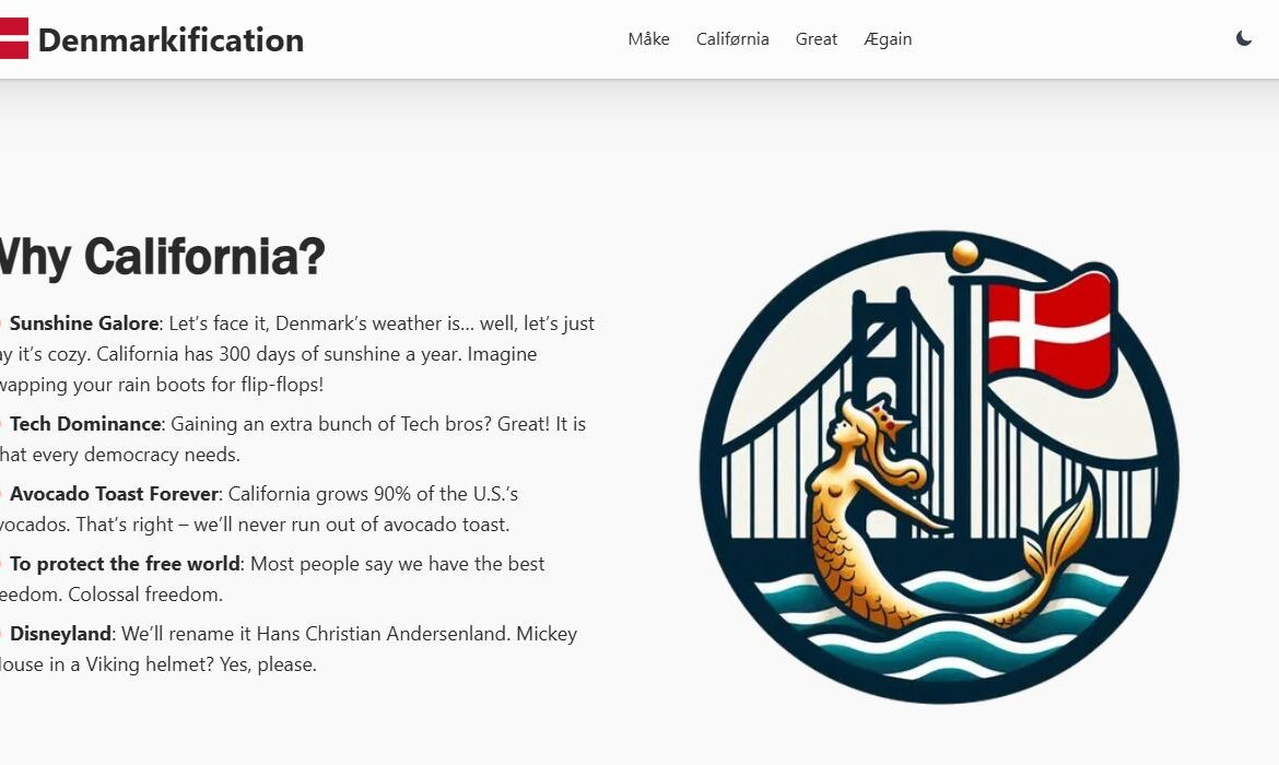 «Έχετε κοιτάξει ποτέ έναν χάρτη και σκεφτεί: «Ξέρετε τι χρειάζεται η Δανία; Περισσότερη ηλιοφάνεια, φοίνικες και πατίνια». Λοιπόν, έχουμε μια μοναδική ευκαιρία να κάνουμε αυτό το όνειρο πραγματικότητα. Ας αγοράσουμε την Καλιφόρνια από τον Ντόναλντ Τραμπ! Ναι, καλά ακούσατε» κάπως έτσι ξεκινά η διαδικτυακή καμπάνια αγοράς της Καλιφόρνια.