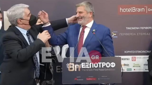 Εμφανώς ζαλισμένος αλλά με τρομερά εύθυμη διάθεση, λέει τα καλύτερα για τον Άδωνι και τον πρωθυπουργό, μοιράζει αγκαλιές με τον Πατούλη, προσπαθεί να κόψει την κορδέλα καθώς πρόκειται για τα εγκαίνια της έκθεσης και γενικά μοιράζει… αγάπη και χαρά.