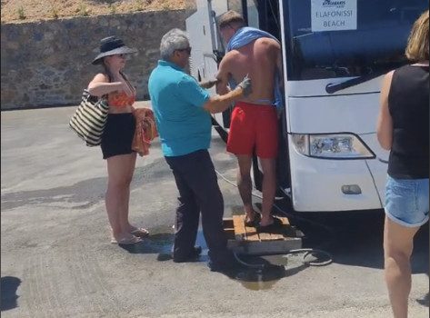 Όπως φαίνεται σε βίντεο που τραβήχτηκε από έναν τουρίστα στο Ελαφονήσι στην Κρήτη, ο οδηγός του λεωφορείου ξεσκονίζει έναν – έναν τους επιβάτες που πρόκειται να καθίσουν στο όχημα, ξεπλένει με λάστιχο τα πόδια τους για να φύγει η άμμος που έχει κολλήσει, κι έπειτα τους πετάει αέρα για να φύγει η άμμος από πάνω τους, τόσο τους ίδιους όσο και τα προσωπικά αντικείμενα που πιθανότατα έχουν άμμο πάνω τους.
