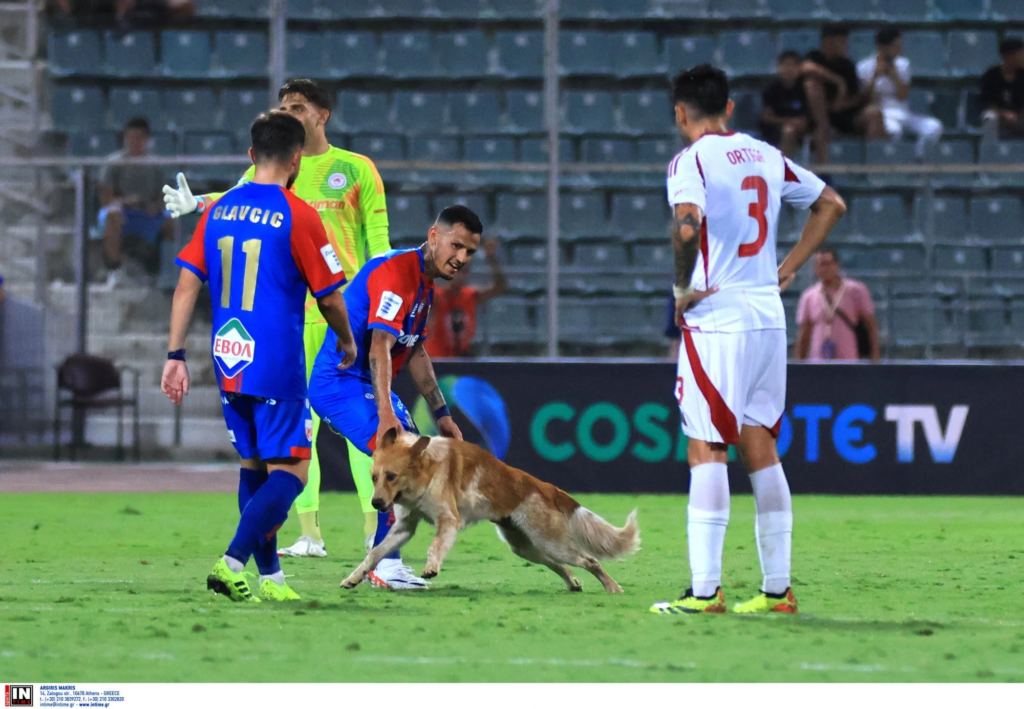 Ένας χαριτωμένος σκύλος βρέθηκε στον αγωνιστικό χώρο του Πανθεσσαλικού Σταδίου, διακόπτοντας προσωρινά τον αγώνα καθώς πλησίασε τους ποδοσφαιριστές, δείχνοντας παιχνιδιάρικη διάθεση.