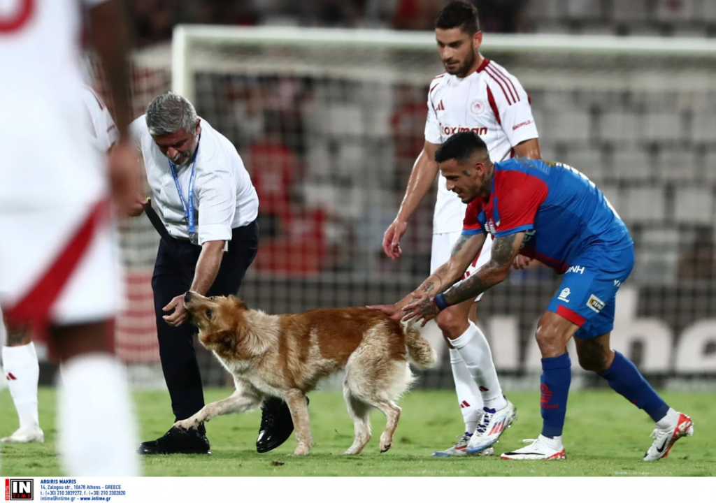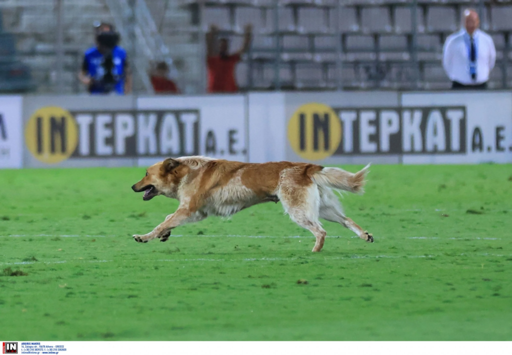 Η απομάκρυνση του τετράποδου “εισβολέα” απαιτούσε τη χρήση λουριού και αρκετή τρυφερότητα, καθώς απέφευγε τις προσπάθειες των ανθρώπων να τον απομακρύνουν, τρέχοντας γύρω από το γήπεδο.