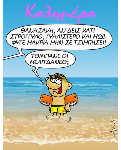 Στο σημερινό σκίτσο, φαίνεται ο Θανασάκης, με τα μπρατσάκια του, έτοιμος να βουτήξει στη θάλασσα, όταν η μαμά του, τον συμβουλεύει να αποφύγει τις μωβ μέδουσες.