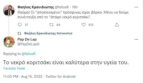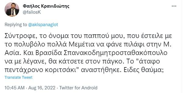 Την σκυτάλη της χυδαιότητας πήρε ο αντιπρόεδρος της Εθνικής Δημιουργίας Φαήλος Κρανιδιώτης. Και με αλλεπάλληλες αισχρές αναρτήσεις ειρωνευόταν τον θάνατο του 5χρονου παιδιού.