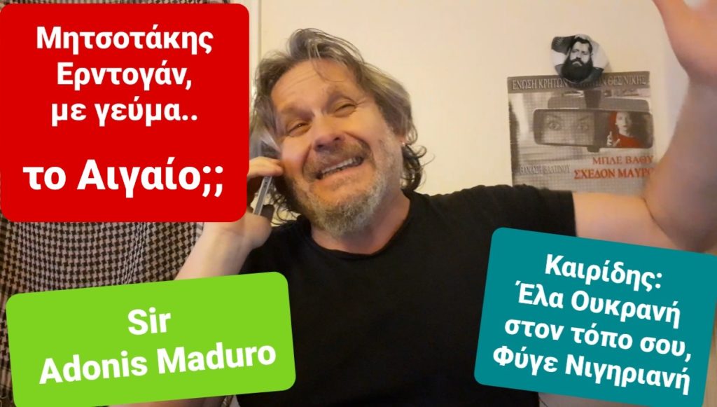 Με ένα ακόμα καυστικό βίντεο ο Θανάσης Μιχαηλίδης σχολιάζει την πολιτική επικαιρότητα, στην οποία πρωταγωνιστούν μεταξύ άλλων η… επίσκεψη Μητσοτάκη στην Τουρκία, ο Σπυρίδων-Άδωνης που ζει ένα δράμα, μιας και οι Αμερικανοί ζητούν πετρέλαιο από τους «Μαδουραίους», ο Πέτσας που μας προτρέπει να ΜΗΝ αγοράζουμε πολλά πράγματα από τα Super market κ.α.