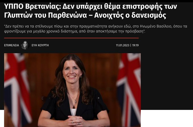 Βρετανία: Τέλος η συζήτηση για τα Γλυπτά – «Ανήκουν σε εμάς, δεν τα επιστρέφουμε!» Μιλώντας στο BBC η βρετανίδα υπουργός Πολιτισμού έβαλε τέλος σε κάθε συζήτηση περί επανένωσης των Γλυπτών του Παρθενώνα . ΚΑΤΑΛΑΒΕΣ ΒΛΑΚΑ ΚΟΥΛΗ…..