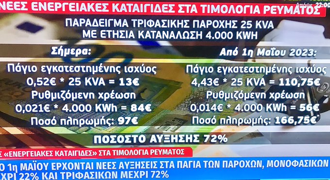 Το πάγιο στο ηλεκτρικό ρεύμα από 1/5/23 αυξάνεται 850%. Από 0,52€ σε 4,43€ μηνιαίως. Εισηγήθηκε η ΡΑΣ, το ψήφισε η Κυβέρνηση, με γεια και καλοφάγωτο γιατί καταλαβαίνουμε τι ανατιμήσεις θα ακολουθήσουν. [Καταλάβατε τώρα τι θα πει Ρυθμιστική Αρχή και στο Νερό;]