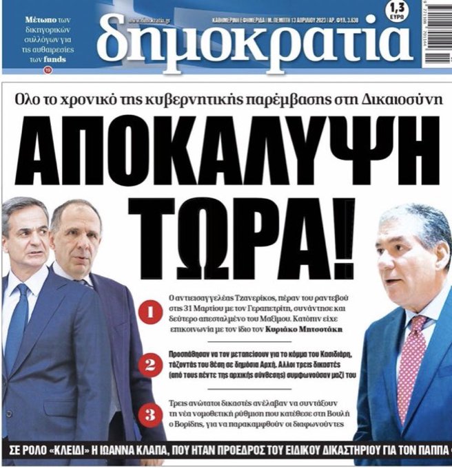 Τελικά πόσο δίκιο είχε ο Πολάκης; Πόσες φορές θα τον δικαιώσει η πραγματικότητα; Αν είχαν συμβεί αυτά με Τσίπρα έχετε καταλάβει τι θα γινόταν σήμερα στη χώρα; Και καλά η ΝΔ του Μητσοτάκη, είναι είναι γνωστό ότι είναι ένα κόμμα μαφιόζων με παρακρατικούς πολιτευτές-πιστόλια, πρόθυμους να κάνουν τα πάντα. Στα πλαίσια αυτά, ο Γεραπετρίτης εντελώς εξωθεσμικά, ζήτησε κ έκανε συνάντηση 2 φορές με τον Τζανερίκο εκτός Μαξίμου κ φυσικά εκτός Αρείου Πάγου. Ο Τζανερίκος γιατί πήγε σε ραντεβού αρχικά σε καφενείο κ έπειτα στο ξενοδοχείο; Τι δουλειά έχει ένας δικαστής του Αρείου Πάγου να συναντάται σε καφενεία με την εκτελεστική εξουσία; Η σήψη κ η διαφθορά επί θητείας Μητσοτάκη διάβρωσε τα πάντα, δεν έμεινε τίποτα όρθιο. Μαυρίστε τους