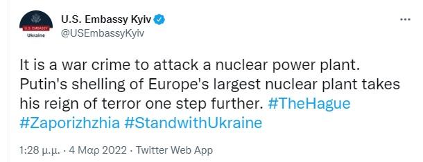 Ο επίσημος λογαριασμός της πρεσβείας των ΗΠΑ στο Κίεβο στο Twitter ανέφερε ότι ήταν «έγκλημα πολέμου η επίθεση σε πυρηνικό εργοστάσιο παραγωγής ενέργειας» και ότι «ο βομβαρδισμός του μεγαλύτερου πυρηνικού εργοστασίου της Ευρώπης από τον Πούτιν οδηγεί την κυριαρχία του τρόμου ένα βήμα παραπέρα».