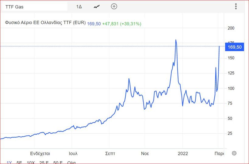 Οι τιμές του φυσικού αερίου στην ΕΕ κάνουν ράλι σχεδόν στα 170 στα ευρώ ανά μεγαβατώρα πλησιάζοντας το υψηλό της 23ης Δεκεμβρίου 2021, (στο intraday το ξεπέρασε) εν μέσω αυξανόμενων φόβων για τις ρωσικές προμήθειες. Χονδρικά 100% αύξηση σ’ενα μήνα 1000% αύξηση σ’ένα χρόνο. ΜΜΕ ανέφεραν ότι οι ρωσικές δυνάμεις κατέλαβαν το λιμάνι της Χερσώνας, καθώς η σύγκρουση εισήλθε σε νέα έντονη φάση με περισσότερους σφοδρούς βομβαρδισμούς σε πόλεις της Ουκρανίας. Η πιθανότητα να σταματήσει η Ρωσία τις προμήθειες στην Ευρώπη ως αντίποινα κατά των σκληρών οικονομικών κυρώσεων από τη Δύση προστέθηκε στους ανοδικούς κινδύνους. Αν και η Ρωσία έχει δηλώσει ότι θα συνεχίσει να εξάγει φυσικό αέριο, περίπου το ένα τρίτο των εισαγωγών της Ευρώπης του ΦΑ περνά από την Ουκρανία, όπου η σύγκρουση θα μπορούσε να προκαλέσει ζημιά σε ζωτικούς αγωγούς. Επίσης εντονα ανοδικές είναι οι τιμές στο Brent.Αυτός που πρώτα πληρώνει το κόστος αυτού του πολέμου πανάκριβα είναι η Ευρώπη, εκτός βέβαια την Ουκρανία που σταδιακά μετατρέπεται σε ερείπια εν μέσω ενος παρανοικού bras de fer Ανατολής Δύσης.