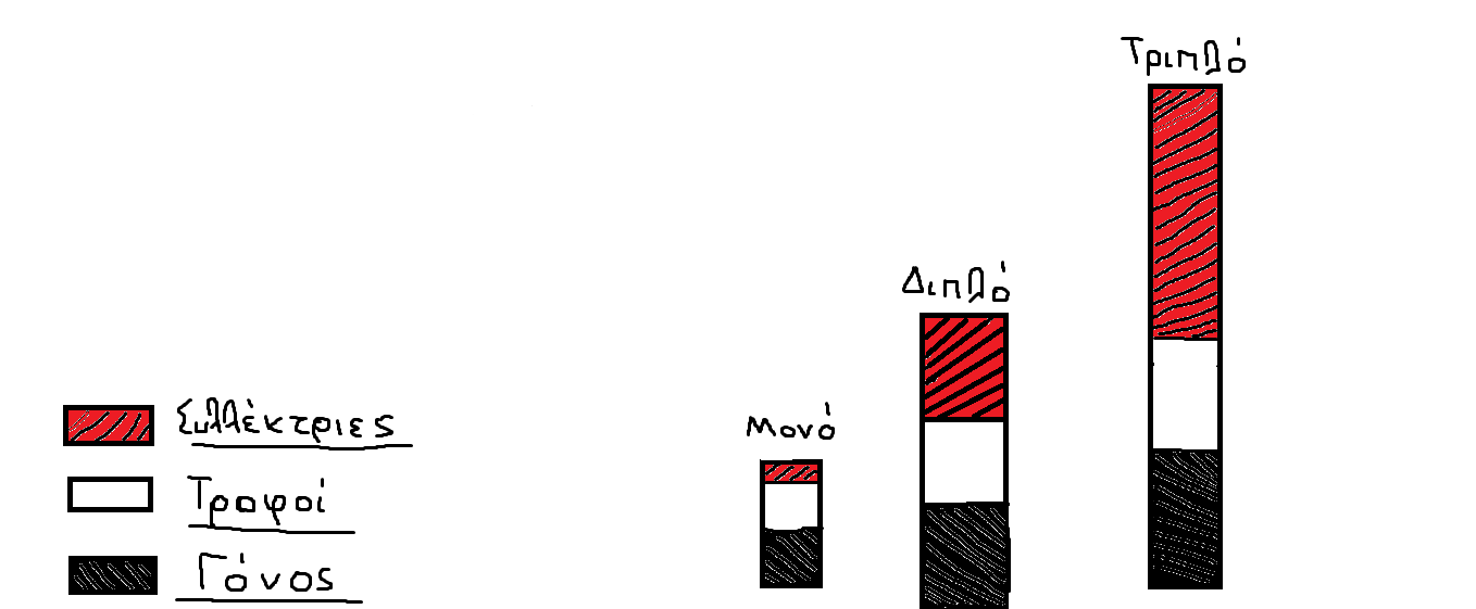 Αν υποθέσουμε ότι έχουμε 50 τριπλά μελίσσια σε μια καλή μελιτοέκκριση με 35 κιλά μέλι το κάθε ένα θα πάρουμε 1750 κιλά μέλι.Αυτά τα κιλά μελιού θα τα πάρουμε εάν έχουμε 117 διπλά μελίσσια με 15 κιλά μέλι το κάθε ένα.Και επίσης αυτά τα κιλά μελιού θα πάρουμε αν έχουμε 350 μονά μελίσσια με 5 κιλά μέλι το κάθε ένα.