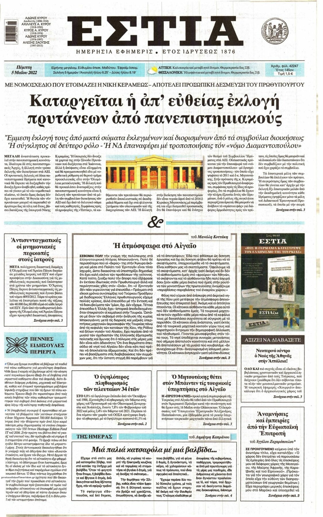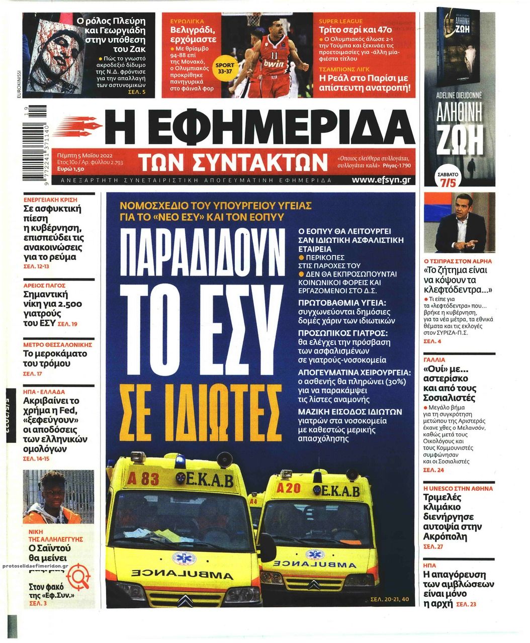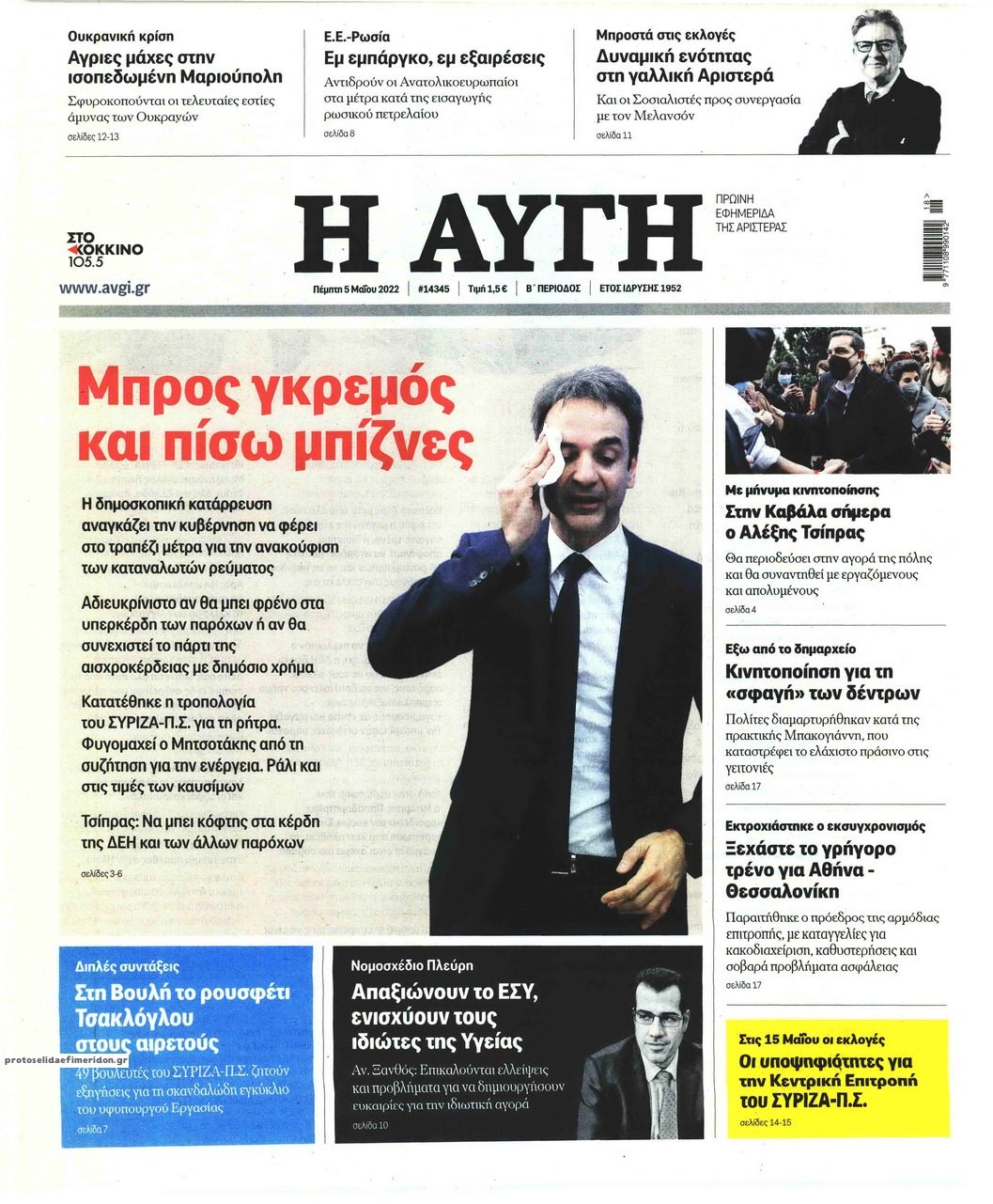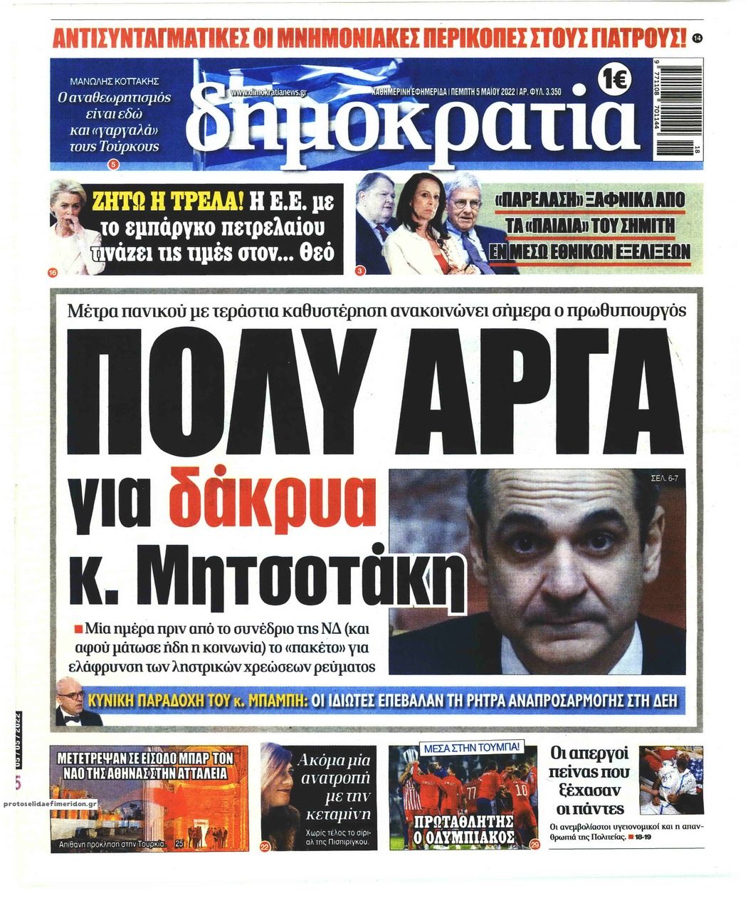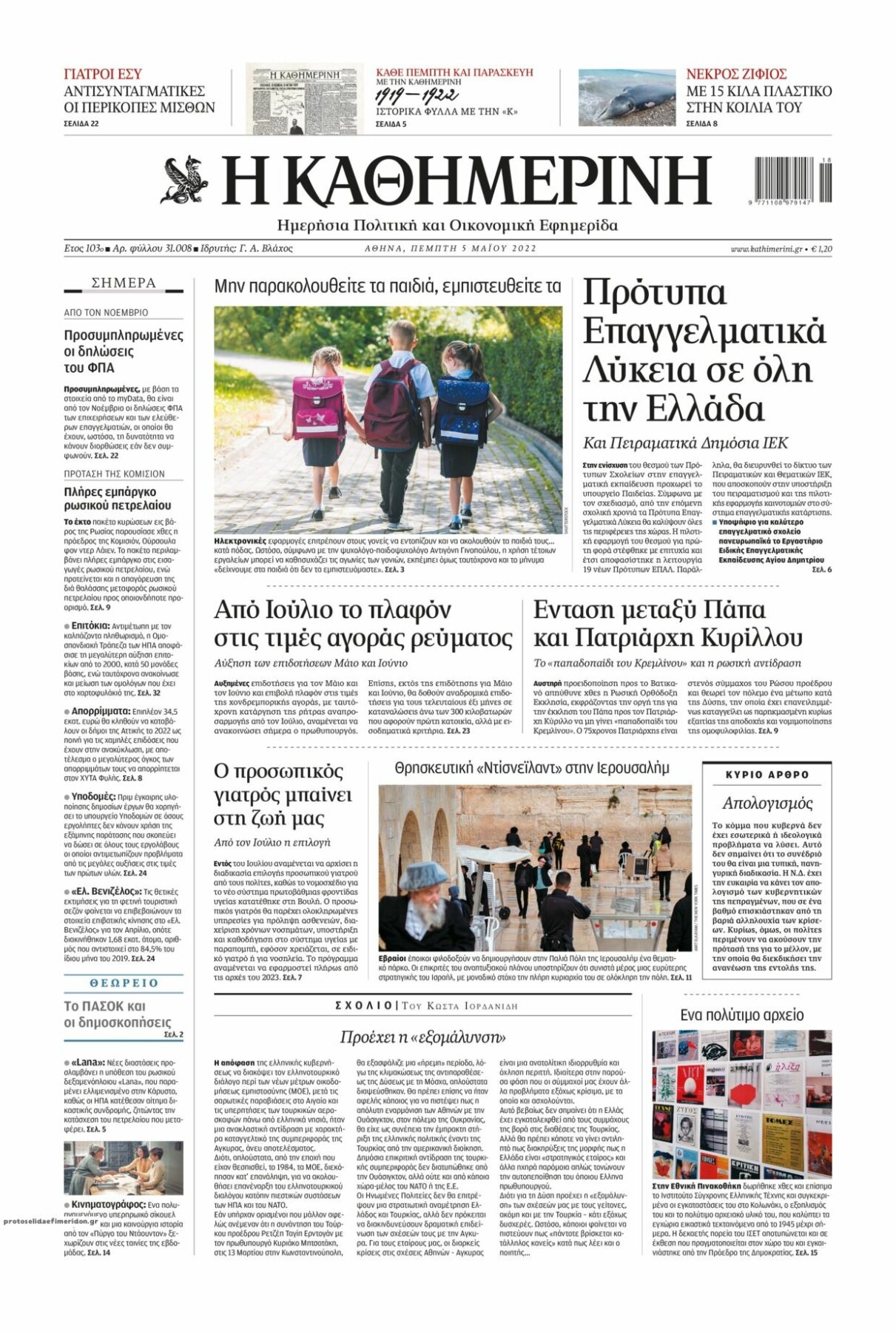 Οι εφημερίδες που κυκλοφορούν σήμερα Πέμπτη 5 Μαίου 2022
